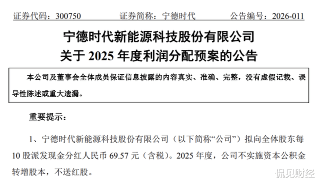 宁德时代还称,公司拟向全体股东每10股派发现金分红人民币69.57元(含税),派发的现金分红金额合计约315.32亿元。
